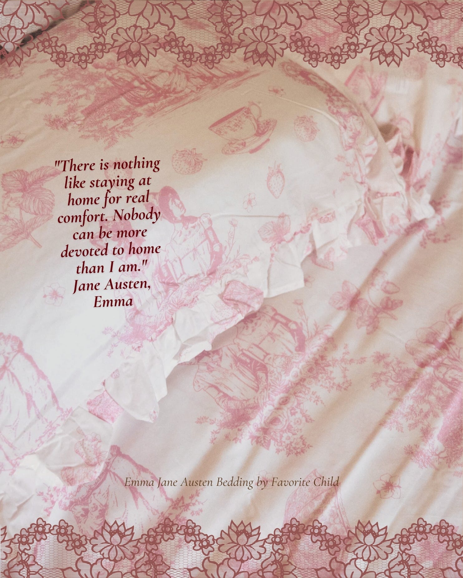 To dream in Jane Austen’s world is to find a sanctuary in the “sacred domestic.” This bedding set, with its delicate floral motifs, reminds us that the home is the first place we must cultivate enchantment!