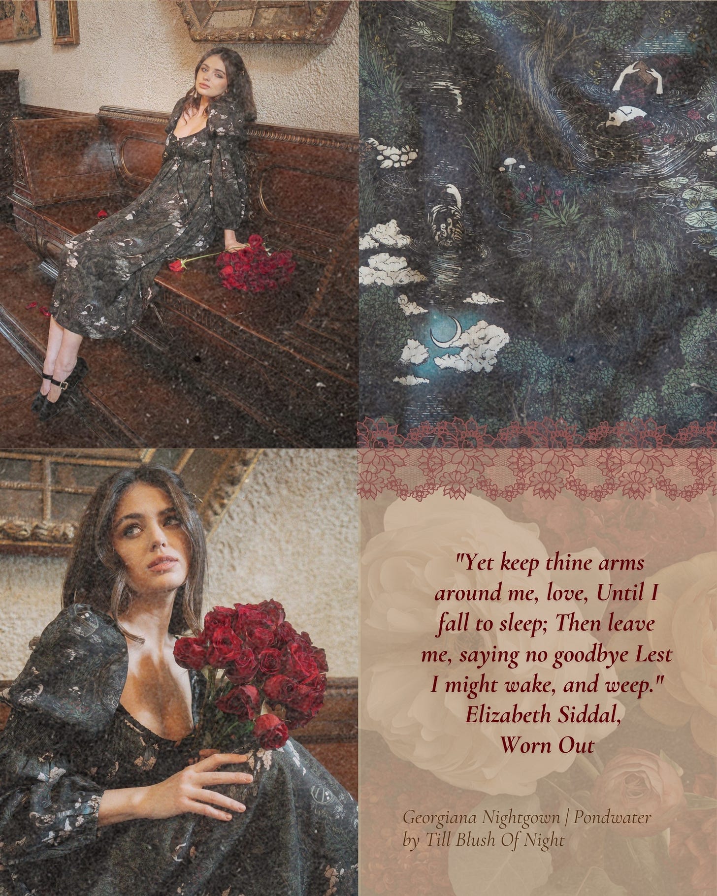 With a print inspired by Arthurian legend and the Pre-Raphaelite gaze, this dress is for the woman who finds romance in the “rose upon a thorn.”