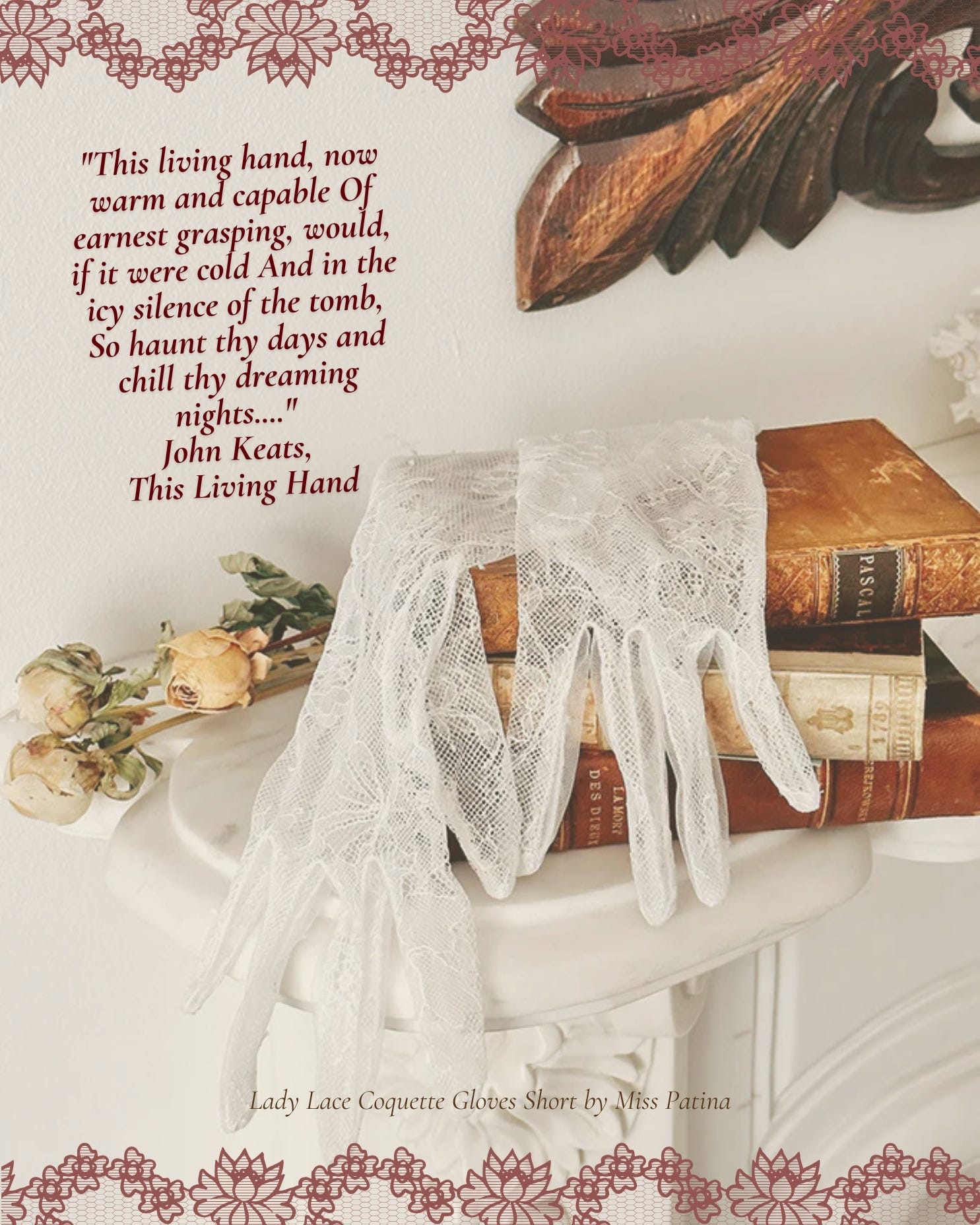 A lady’s hands tell her story, and these short lace gloves are the ultimate “coquette” accessory, perfect for the woman who communicates in glances, whispers, and the soft texture of a “fallen lily.”