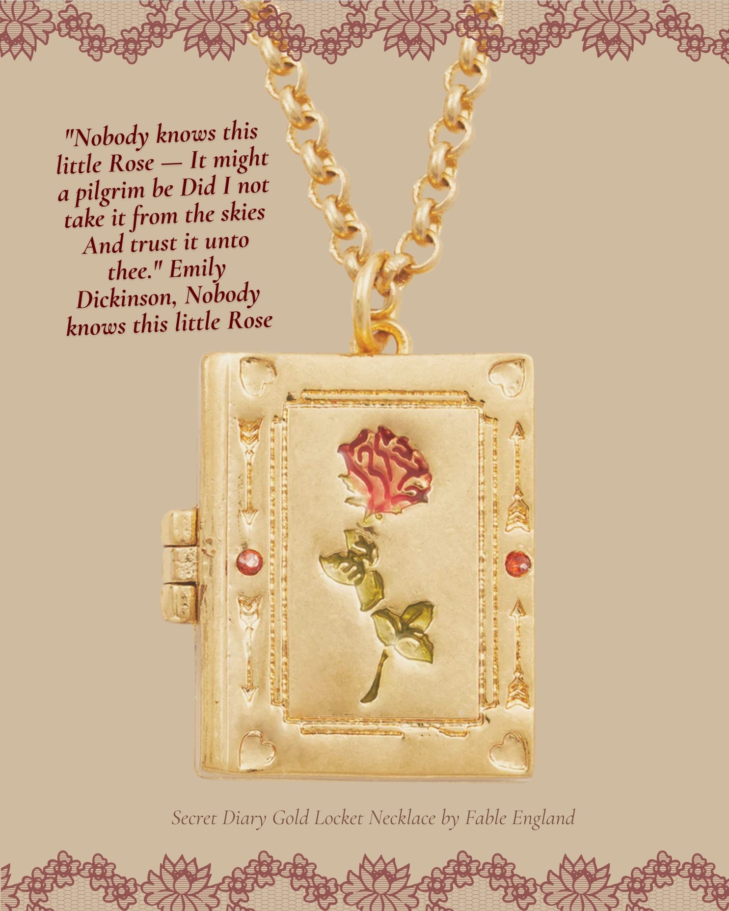 A gold-plated book to be worn near the heart, hand-painted with a single red rose. In an age of oversharing, there is a profound power in keeping a secret.