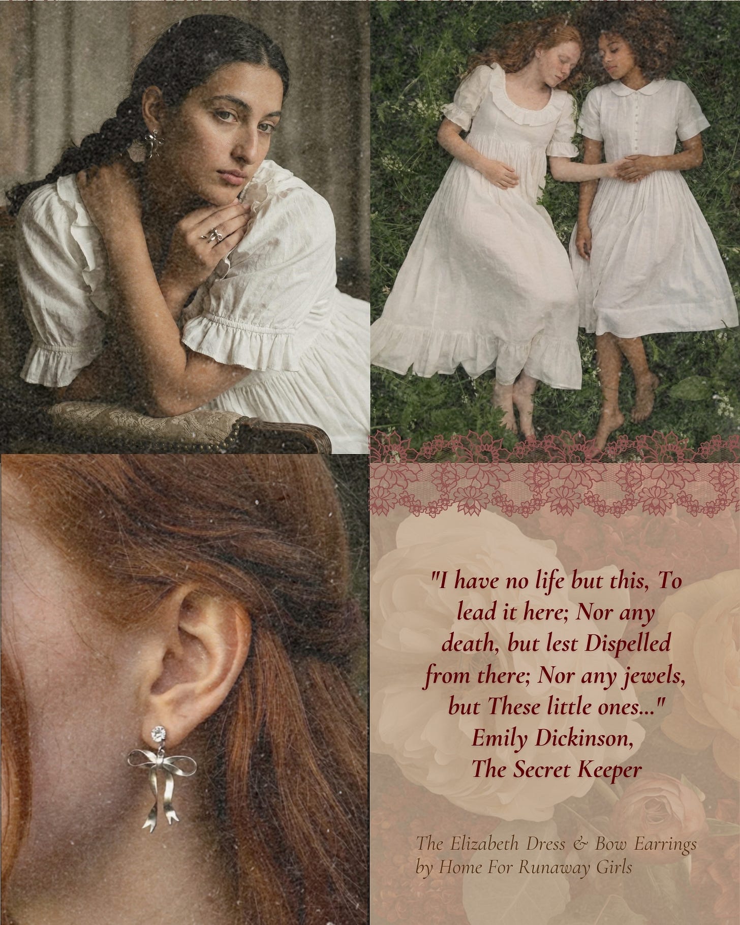 Named after the spirited Elizabeth Bennet, this fine cotton dress is designed for jumping over stiles and springing over puddles! OR as the uniform of a woman who values her own mind as much as a morning walk through the fells in the Lake District. Paired with these delicate bow earrings, it’s a match made in heaven.