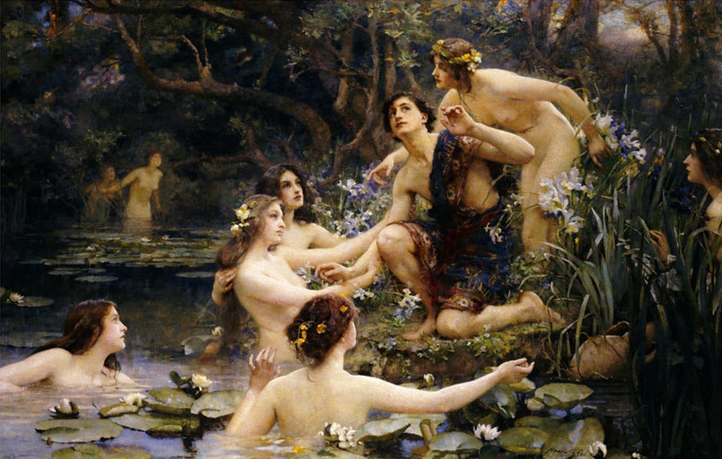 So, let us begin with the painting before us. At first glance, the scene in ‘Hylas and the Nymphs’ appears simple: a young man, Hylas, leaning over the mirrored surface of a secluded forest pool, held fast by the gaze of water-born maidens. Yet behind this single moment lies an ancient tale…..