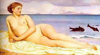 Here Leighton brings to life an Irish river spirit with a coy, almost self-aware grace. Draped in creamy drapery by a falling stream, she is the very embodiment of liminal beauty; the threshold between solid land and living water.